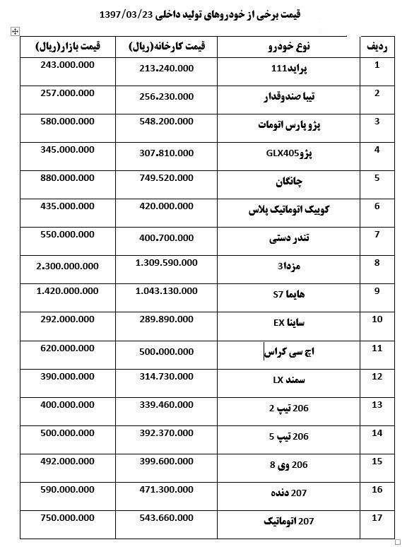 قیمت تعدادی از خودروهای داخلی در بازار امروز به شرح زیر است: