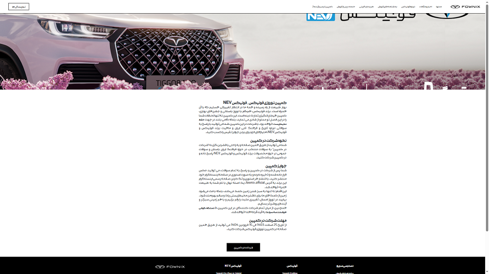 پس از شنبه، 25 اسفند می توانید دست به کار شوید و با حضور در نمایندگی‌ها و مراکز تجاری، QR  کد تعبیه شده کنار محصولات پرچمدار مانند تیگو 8 پرو مکس و تیگو 8 پرو پلاگین هیبرید را اسکن نمایید و یا در صفحه اینستاگرامی Fownix.official از طریق لینک ارائه شده، در مسابقه شرکت کنید.